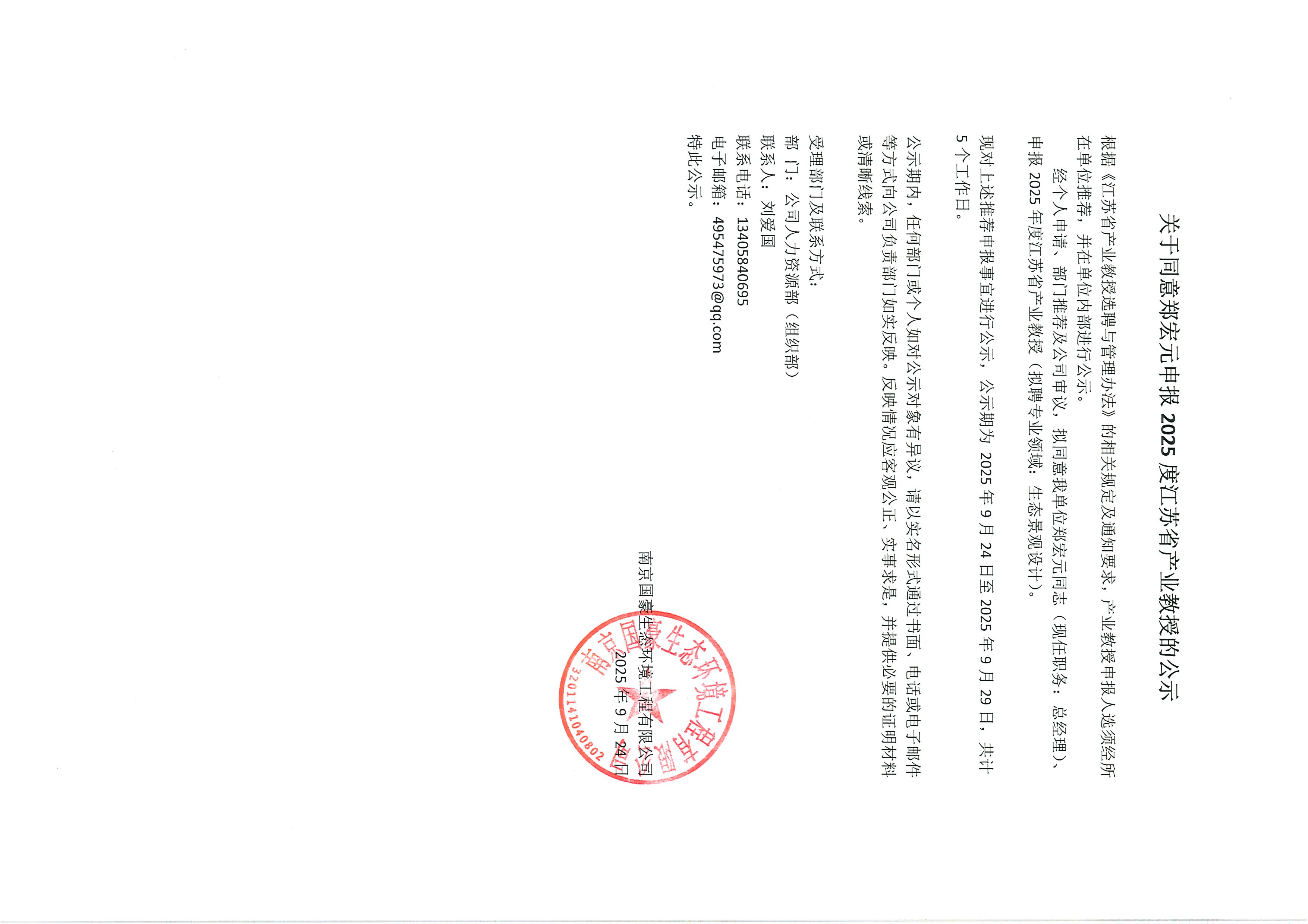 关于同意郑宏元申报2025度江苏省产业教授的公示